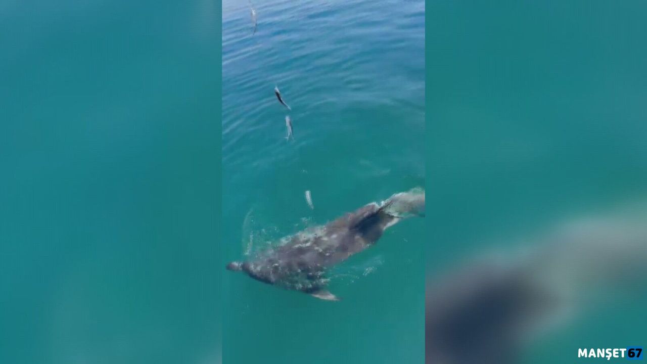 Balıkları oltayla zaman zaman sağa sola çekerek yunusu yüzdüren balıkçılar, oltadaki balıkları yunusa yedirdiler. O anları balıkçılardan biri ise cep telefonu kamerasıyla görüntüledi.