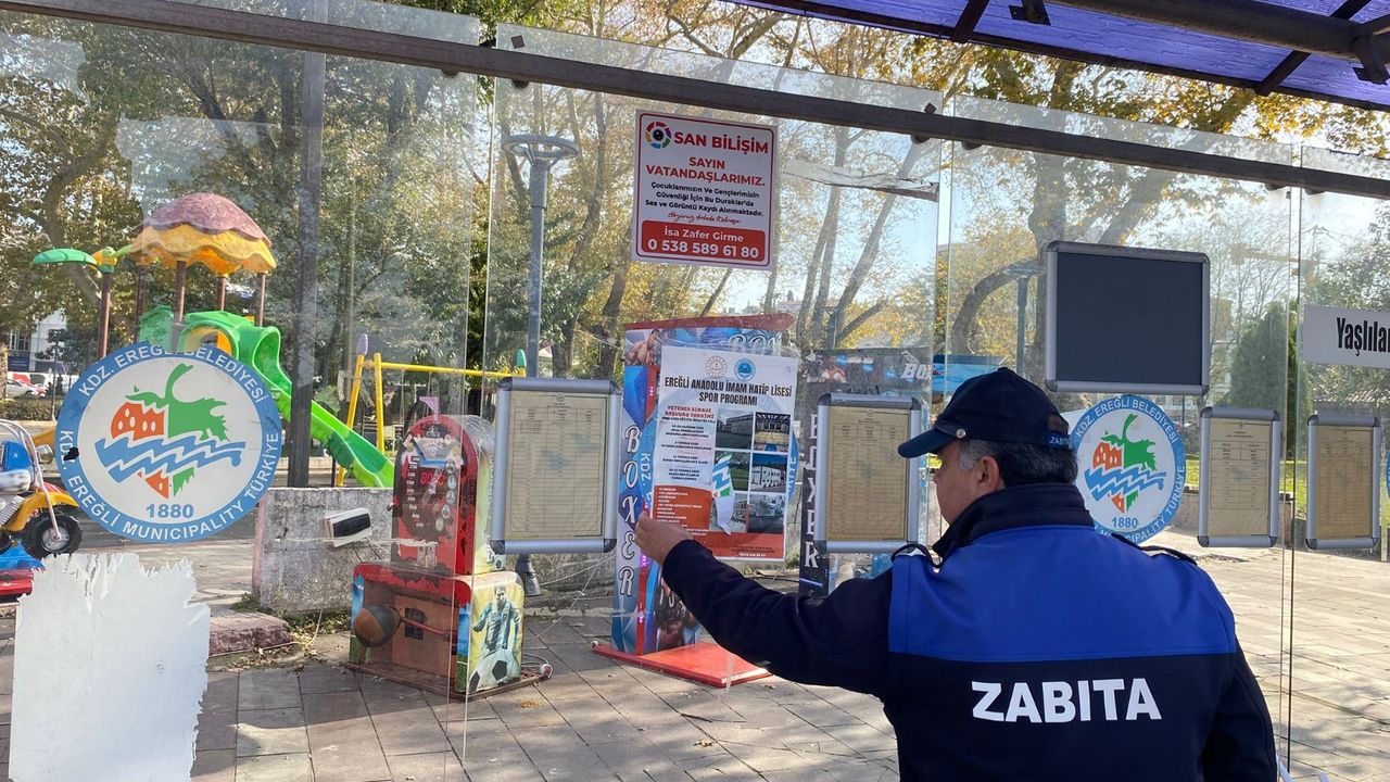 Kdz. Ereğli Belediyesi Zabıta Müdürlüğü ekipleri, kent genelinde duvarlara, direklere ve otobüs duraklarına yapıştırılan izinsiz afişlere yönelik çalışma başlattı, gelişigüzel yapıştırılan afişler kaldırıldı, kişi ve kurumlara ceza kesildi.