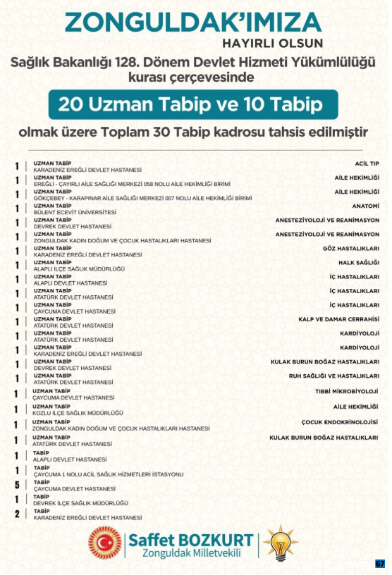 AK Parti Zonguldak Milletvekili Saffet Bozkurt, Sağlık Bakanlığı tarafından yürütülen 128. Dönem Devlet Hizmet Yükümlülüğü (DHY) kapsamında Zonguldak’a önemli bir sağlık yatırımı yapıldığını duyurdu.