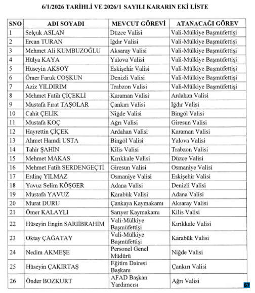 Vali atamaları 2026 Resmi Gazete'nin 7 Ocak tarihli sayısında yayımlandı. Cumhurbaşkanı Recep Tayyip Erdoğan’ın imzasıyla yayımlanan karara göre Karaman Valisi Mehmet Fatih Çiçekli Ardahan Valiliği'ne, Çankırı Valisi Mustafa Fırat Taşolar Iğdır Valiliği'ne, Niğde Valisi Cahit Çelik Bingöl Valiliği'ne, Ağrı Valisi Mustafa Koç Giresun Valiliği'ne, Ardahan Valisi Hayrettin Çiçek Karaman Valiliği'ne, Bingöl Valisi Ahmet Hamdi Usta Yalova Valiliği'ne, Kilis Valisi Tamer Şahin Trabzon Valiliği'ne, Kırıkkale Valisi Mehmet Makas Düzce Valiliği'ne, Giresun Valisi Mehmet Fatih Serdengeçti Osmaniye Valiliği'ne, Osmaniye Valisi Erdinç Yılmaz Eskişehir Valiliği'ne, Adana Valisi Yavuz Selim Köşger Denizli Valiliği'ne, Karabük Valisi Mustafa Yavuz Adana Valiliği'ne, Çankaya Kaymakamı Murat Duru Aksaray Valiliği'ne ve Sarıyer Kaymakamı Ömer Kalaylı Kilis Valiliği'ne atandı.